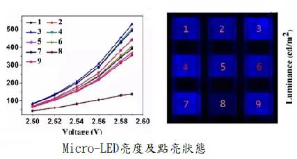 2、通过装置拍摄工作状态下Micro LED数组的图片,经过编写的软件便可得到不同芯片的平均亮度。例如8号芯片的亮度仅为相同电压下其余芯片的三分之一,可确定8号芯片异常。因此,该系统既可以定量检Micro LED数组的工作状态,也可以用于快速检测Micro LED数组的坏点。