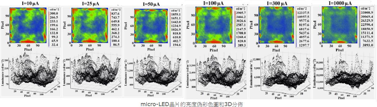3、形成不同电流下单颗Micro LED芯片的亮度伪彩图和亮度3D分布图。通过调节供电电流,如10uA、100uA、1000uA等参数,可以改变Micro-LED芯片表面亮度的均匀性,形成不同的亮度效果,对产品性能进行研究。可以看到在1000uA驱动电流的情况下,更多的点位于平均亮度附近。