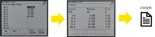 CA550通过为校准对象的每个步骤设置源值,可以自动执行输入/输出测试。校准结果(如发生值、测量值、错误率、日期/时间和通过/失败)以CSV格式保存在CA550内存中。通过标准USB电缆将CA550连接到PC,可以将该仪器识别为大容量存储设备,用来将数据传送给PC。该方法无需任何编程知识,简单几步即可生成结果。