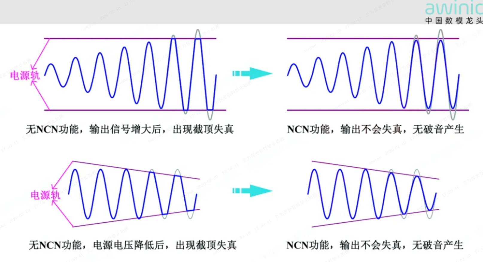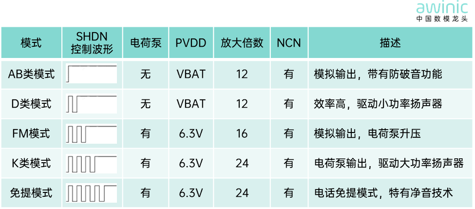 音频应用中,输入信号过大或电池电压下降等因素都会导致音频放大器的输出信号发生破音失真,并且过载的信号会对扬声器造成永久性损伤。艾为独特的防破音(NCN)功能可以通过检测放大器的破音失真,自动调整系统增益,使得输出音频信号保持圆润光滑,不仅有效地避免了大功率过载输出对喇叭的损坏,同时带来舒适的听音感受。 AW8735的五种模式全部带有NCN功能,有效防止破音生产,保护喇叭不被损坏。