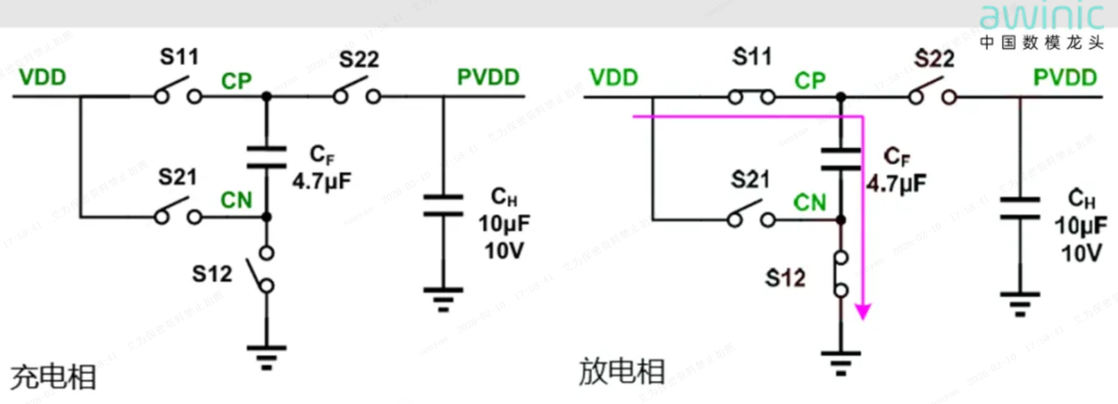 采用高压dual-gate CMOS工艺,内置两倍电荷泵电路,在3.3V~4.5V的电源电压范围内,为内部功放电路提供6.3V的高压电压轨,允许功放在锂电池电压范围内提供更大的输出动态范围,从而实现大音量、高品质的K类音响功放播放效果。艾为K类功放的两倍电荷泵电路包括4个开关,通过对4个开关的时序控制,将PVDD电压升高到6.3V。