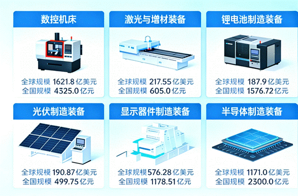 全球维度下,我国通用设备核心品类已形成规模优势。激光与增材装备全球规模217.55亿美元,锂电池制造装备187.9亿美元;数控机床全球规模1621.8亿美元,其中国内市场规模4325.0亿元,同比增长5.75%。细分领域呈现分化:光伏制造装备全国规模499.73亿元,同比高增21.26%;显示器件制造装备全国规模7908.25亿元,同比增长2.59%;精密仪器设备全球规模3462.98亿美元,国内市场1178.51亿元,同比下滑14.03%,反映高端领域仍面临竞争压力。