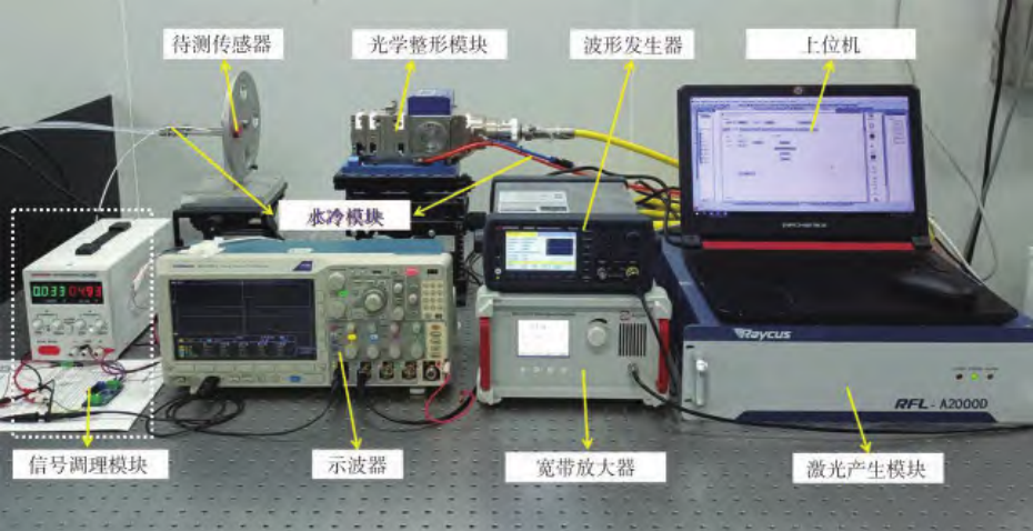 1.搭建热流动态标定平台,核心包含激光产生、信号调制(波形发生器+宽带放大器)、光束整形、信号调理、数据采集(示波器)及水冷冷却等模块,保障实验稳定开展。