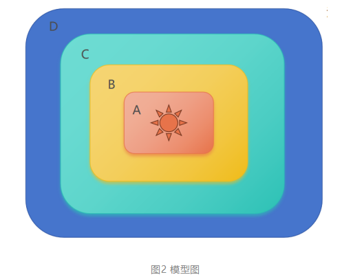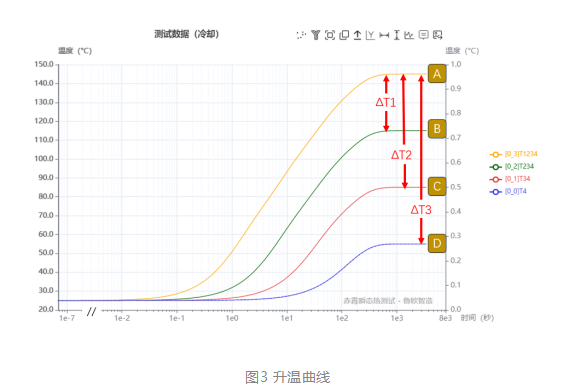 达到稳态后的曲线温度从高到低,分别对应A层材料、B层材料、C层材料、D层材料。对于这个样品来说,总热量从中心的热源出发,向四面八方传递,形成温度场分布。温度场一般使用等温线来描述其形态,也就是说,从里向外,会有一层层的温度梯度,故上述模型每一层材料温度上升的终点如图3所示,是从内向外递减的。