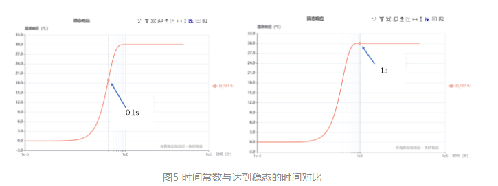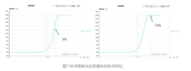 为了了解合适的测试时间与时间常数(时间常数,即温度变化量达到总温度变化量的63.2%处的时间。在数学上常常使用的符号为:「τ」)之间的关系,设计了一组实验,共选用三种时间常数分别为0.1s、1s、10s的材料,分别进行了热测试,测试结果见图5-7。
