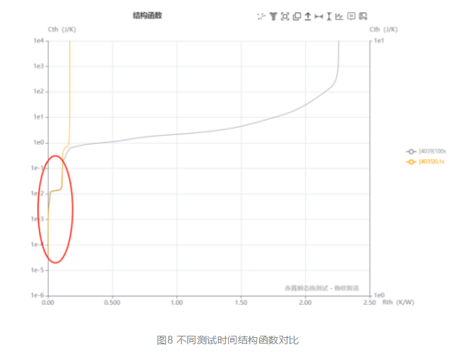 下图是按照上述的实验条件,同一器件同一测试条件下加热时间分别为0.1s、100s条件下测得的数据经分析得到的结构函数。