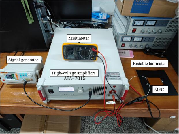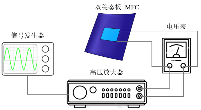 实验原理:本研究基于纤维曲线铺放变刚度理论,利用宏纤维复合材料(MFC)的逆压电效应驱动双稳态板产生面内刚度变化和稳态跳变;通过中心固支边界条件和多参数位移函数建立力学模型,结合Abaqus有限元仿真和实验装置(如信号发生器、高压放大器)进行验证;创新采用MFC粘贴角度优化和PID控制算法,实验表明能显著降低临界跳变电压(如VS-1型可至244V),并在0.3-2秒内快速抑制振动,为可变形结构提供高效控制方案。