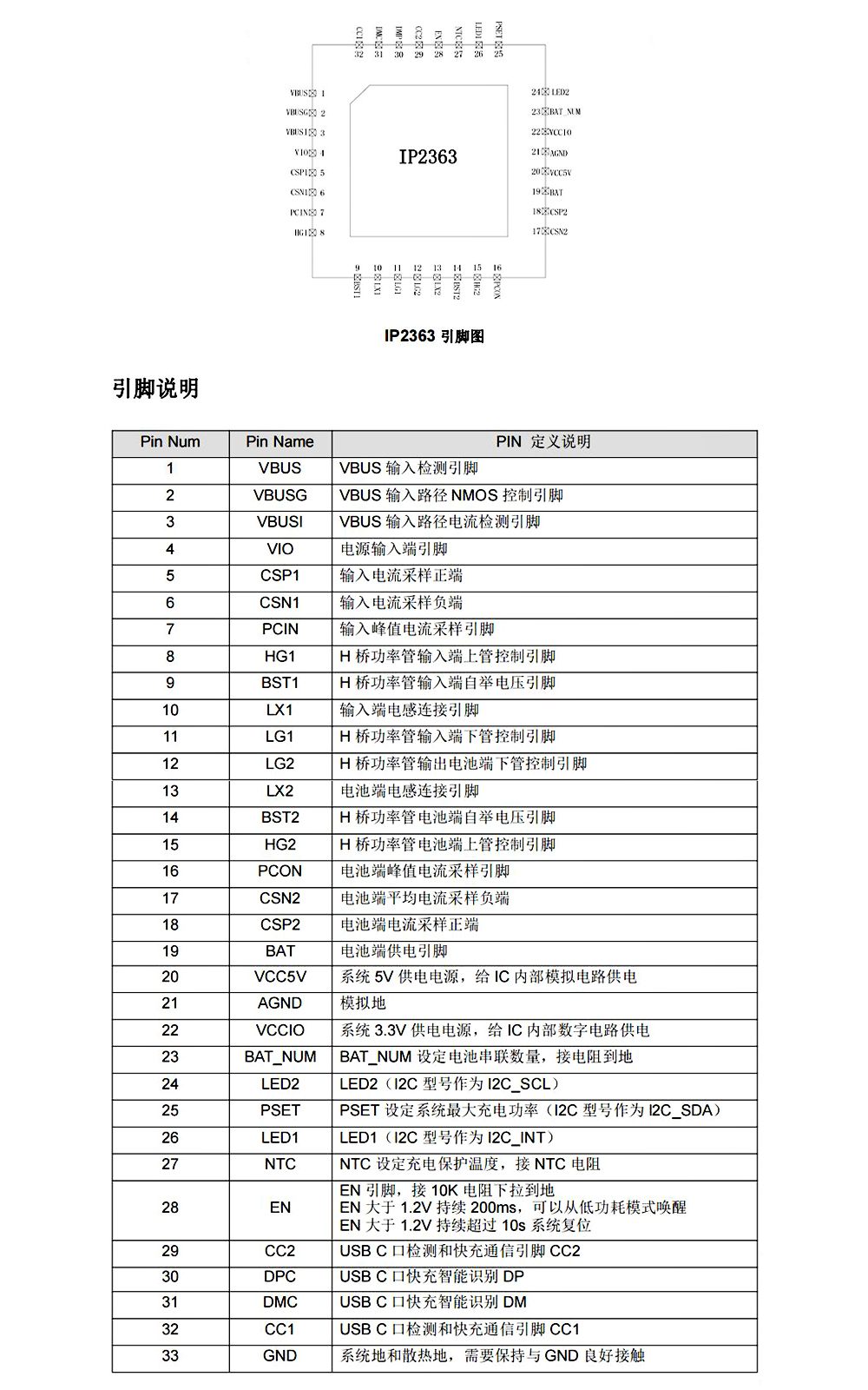 IP2363具备智能管理与低功耗特性。芯片内置温度与电压检测环路,可根据充电器功率调节充电电流,实现功率自适应,兼顾充电效率与安全。在未连接充电器时,芯片进入低功耗模式,待机电流为5μA,有助于降低电池闲置损耗。接入充电器后可自动唤醒并开始充电。IP2363提供两种型号:IP2363_I2C支持I2C通信,可读取充电数据并配置参数;IP2363_BZ为纯硬件设计,通过引脚配置相关参数。