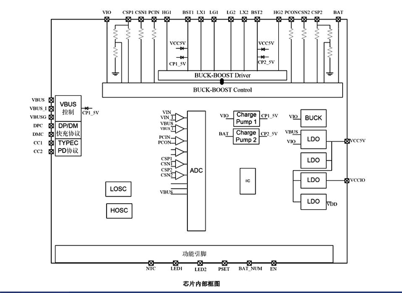 芯片集成14bit ADC,可精确监测输入输出电压、充电电流及电池状态等信息。在保护方面,具备输入过压/欠压、电池过充/过流、IC过温及电池NTC温度保护等功能。输入引脚耐压达30V,ESD防护为4KV,有助于提升系统可靠性。芯片同时支持1-2路LED指示灯,用于显示充电状态。