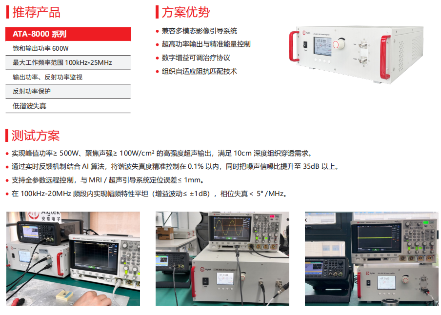 基于声学模拟与治疗计划,系统优化策略,实现高效热消融,成为了精准肿瘤重要方向。ATA-8000系列射频功率放大器能帮助该系统实现峰值功率≥500W的高强度超声输出,满足10厘米深度组织穿透需求,在100kHz~20MHz频段内实现幅频特性平坦,相位失真<5°/MHz。