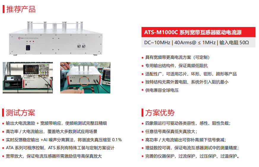 高频电流激励信号的生成与高保真放大,是电流传感器频率响应测试的核心挑战,在评估传感器带宽,相位延迟及动态响应特性时,为了保证测试精度与范围完整,需在宽频域(如50Hz~1MHz)内,使用到幅值稳定,波形可控的大电流进行激励,因此具有宽频带响应特特性,驱动信号为大电流的ATS-M1000系列宽带互感器驱动电流源成为首选,可覆盖绝大多数电流传感器测试应用场景。