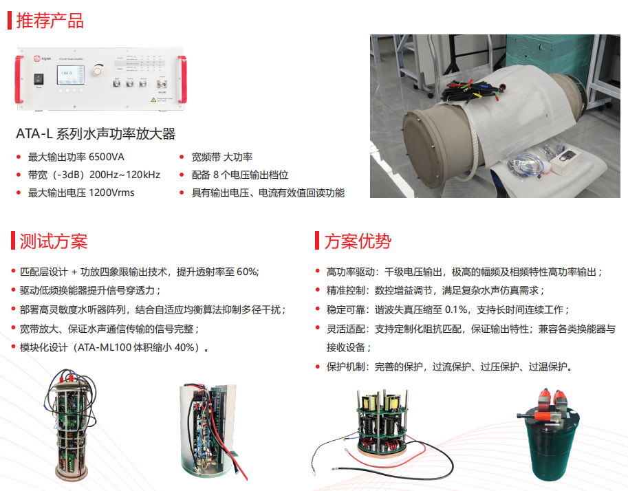 声波是水下环境中信息与能量传递的核心载体,广泛应用于海洋资源勘探,海底地形测绘,水下通信及军事探测等领域,高功率、高保真的水声信号激发与接收技术,是提升水下探测与通信性能的关键。ATA-L系列水声功率放大器在该领域有很好的应用。