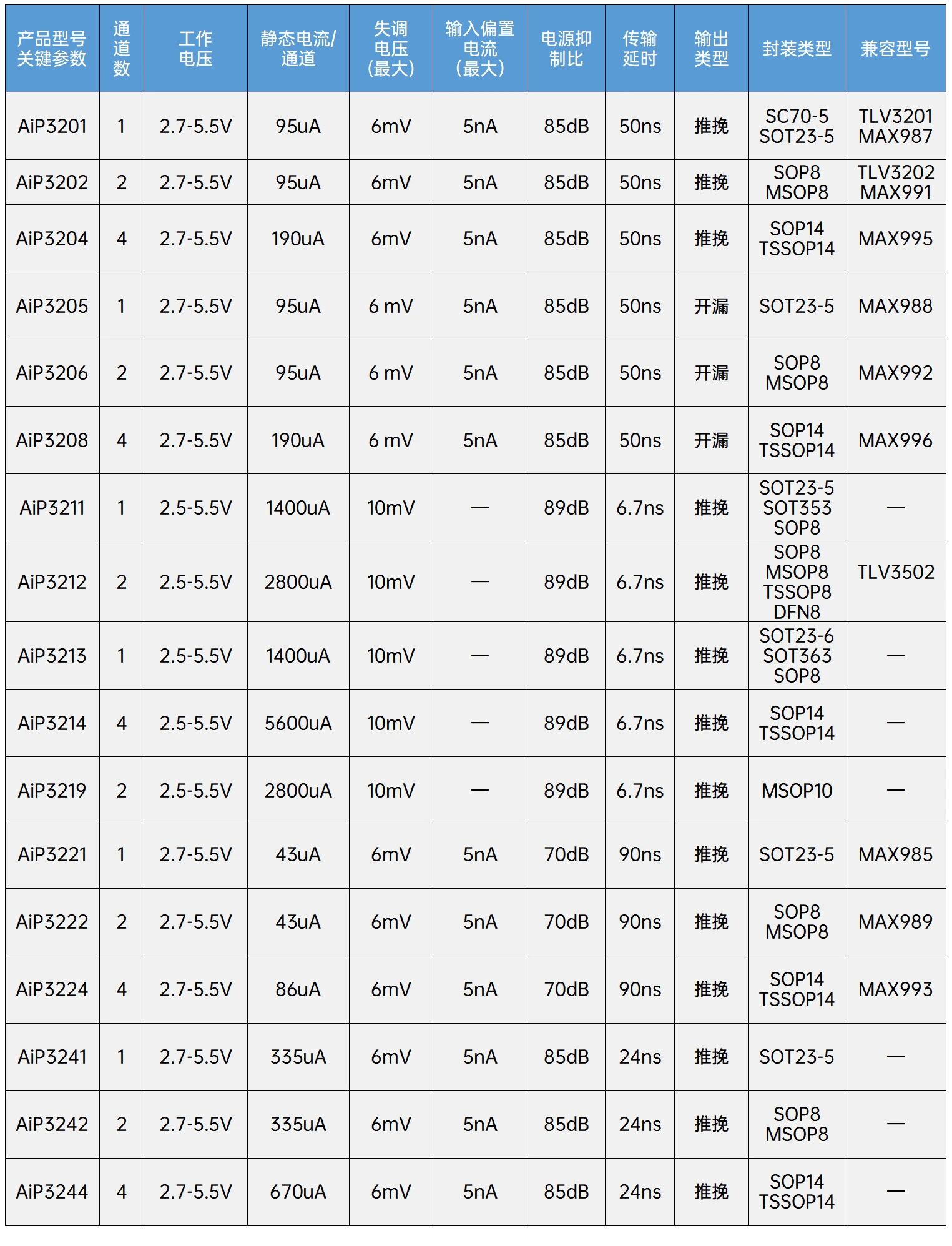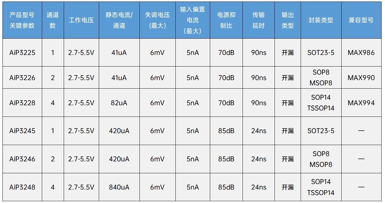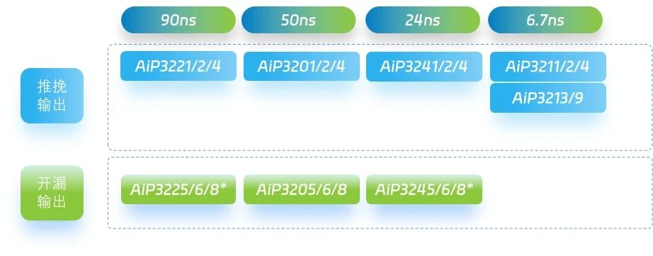 AiP320X、AiP322X和AiP324X系列比较器的传输延时分别为50ns、90ns和24ns,其中,AiP320X系列支持推挽输出和开漏输出两种类型,AiP322X和AiP324X目前提供推挽输出电路。