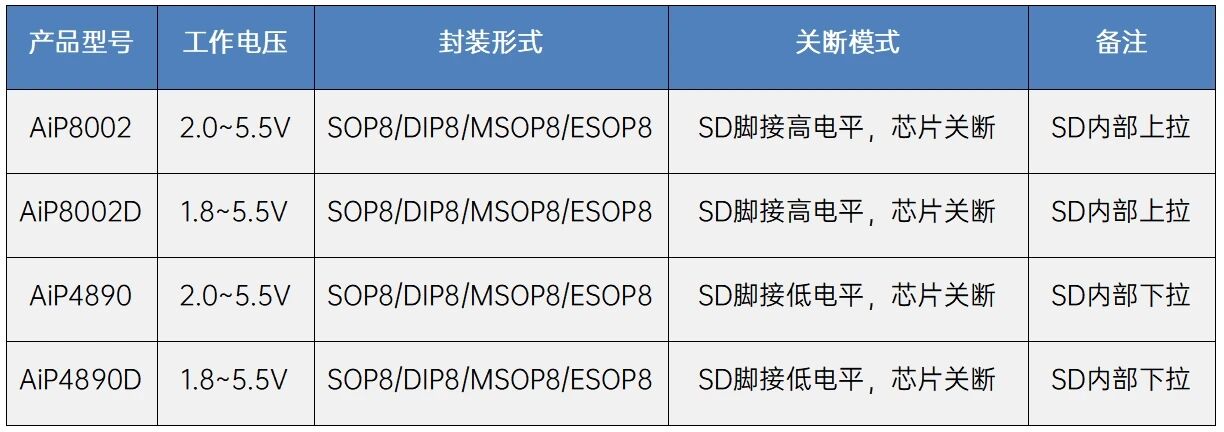 5.关断功能AiP8002、AiP8002D、AiP4890、AiP4890D的SD脚均内部集成上拉或者下拉。默认状态下处于关断模式。在很多应用中,建议使用MCU来控制SD,好处是能使电路迅速、平稳的转换状态。也可以使用单掷开关进行切换。