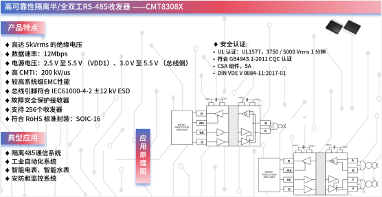 CMT8308X是一系列集成了RS-485接口的隔离接口芯片。它们在单芯片内实现了数字隔离与物理层接口功能的高度集成,可直接构建隔离型通信链路,有效抑制共模干扰与地电位差对总线信号的影响,避免高压侧异常电压经通信线路传导至控制与外设端口。