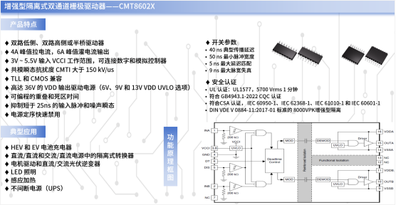 CMT8602X是一系列具备3.75/5.75kVrms隔离耐压、CMTI≥±150kV/μs,拥有4A峰值拉电流和6A峰值灌电流的隔离驱动芯片。