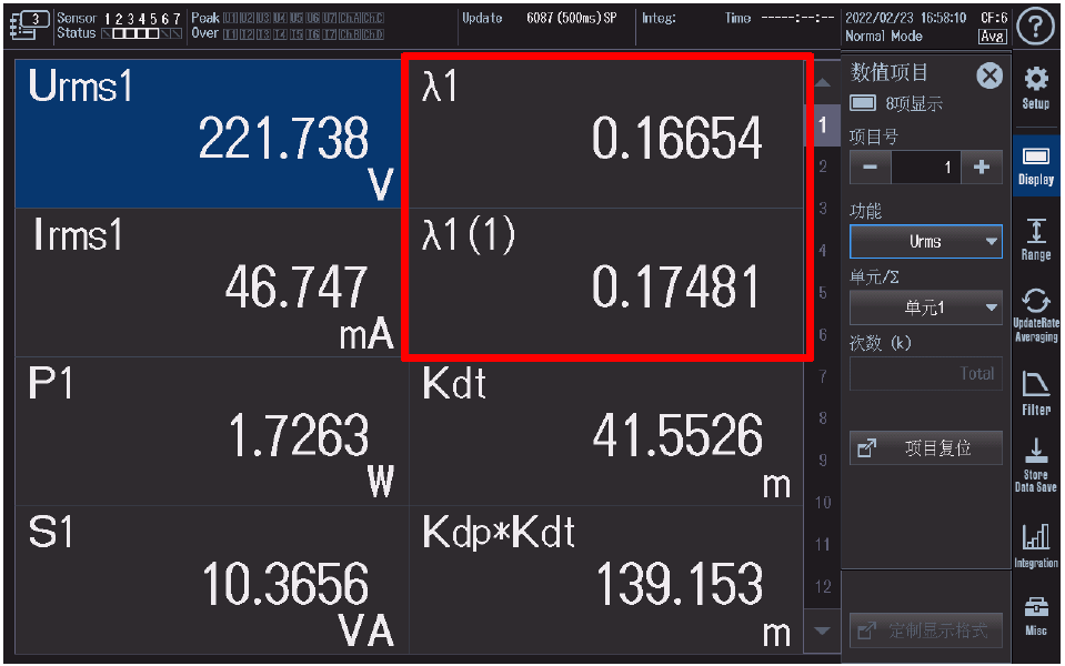 横河功率分析仪是可以直接测量功率因数的,有些客户会错误地把功率因数当成位移因数来使用。其实,虽然功率分析仪的常规测量项目里面没有位移因数这一项,但是,测量谐波的功率分析仪是可以直接测量位移因数的。带有谐波分析功能的功率分析仪,除了可以测量电流、电压、功率的谐波外,还能测量功率因数的谐波。根据位移因数的概念,位移因数就是基波功率因数。我们只需要对功率因数进行谐波分析,第一次的值就是位移因数。(如下图红色框的项目)