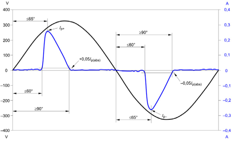 条件二:电流第3次谐波不超过86%,5次谐波不超61%,电流波形满足下图要求。(以电压的过零点作为0°,第一个电流阀值的5%的点的角度≤60°,电流峰值的点的角度≤65°,第二个电流阀值5%的点的角度≤90°)