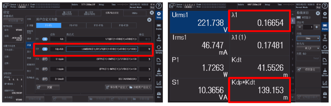 如果希望按照规范的要求算出功率因数,只需要在自定义公式里把F2的表达式设置为位移因数乘以失真因数,相当于在F1的运算式的基础上再乘以λ1(1)得到:LAMBDAK(E1,OR1)/ SQRT(1+ITHD(E1)*ITHD(E1)/1000), 然后在测量项目中调出F2,就可以得到规范定义的功率因数值。如下图: