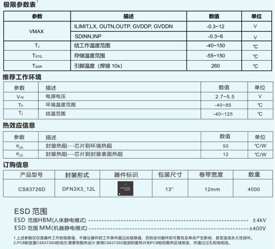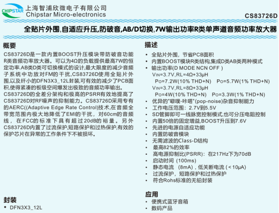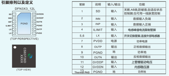 CS83726D 是一款专为便携式设备设计的 R 类单声道音频功率放大器,采用 DFN3X3_12L 纤小封装,全贴片外围设计大幅节省 PCB 面积,工作电压范围 2.7~5.5V,适配单节锂电池供电场景,主要应用于便携式蓝牙音箱、数码产品等,ESD 防护达 ±4kV(HBM),工作环境温度 - 40℃~85℃,结温范围 - 40℃~125℃,需通过 PCB 散热设计让底部散热片与散热区域相连。