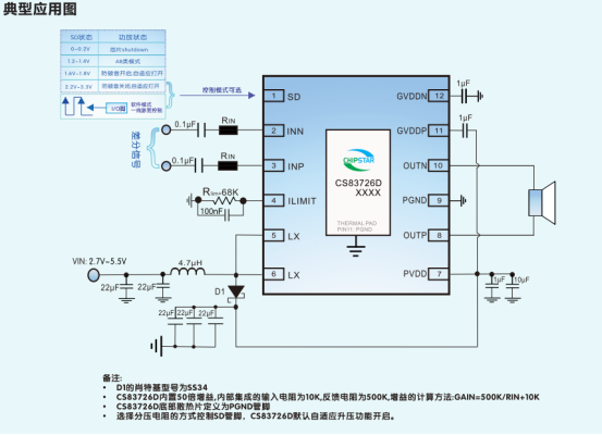 功能设计丰富且实用,支持 AB/D 类模式切换,可最大限度减少对 FM 的干扰,搭配专有 AERC 技术大幅降低 EMI,60cm 音频线在 FCC 标准下有超 20dB 裕量,输出端搭配磁珠即可通过 FCC B 级测试,噪声敏感场景可加 LC 滤波。内置 50 倍固定增益(集成 10K 输入电阻和 500K 反馈电阻),具备独特的无破音(NCN)功能,可自动检测并调整增益避免失真,保护扬声器;还拥有完善的 Pop&Click 杂音抑制,消除开关机等操作的瞬态噪声。SD 管脚支持分压电阻和一线脉宽两种控制方式,可实现关断、AB 类模式、防破音 / 自适应升压开启 / 关闭的灵活切换,ILIMIT 引脚可通过下拉电阻限制 BOOST 电感峰值电流并实现电源软启动。