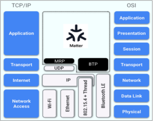 从OSI参考模型角度上看,Matter 协议是基于应用层构建的智能家居专用应用框架,它基于TCP/UDP传输层、IPv6网络层实现通信,可适配多种底层网络技术(如 Wi-Fi、Thread、以太网)。