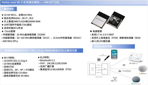 HM-MT7201是一款基于2.4 GHz频段的Matter over Wi-Fi无线通信模块,专为紧凑尺寸的应用而设计。