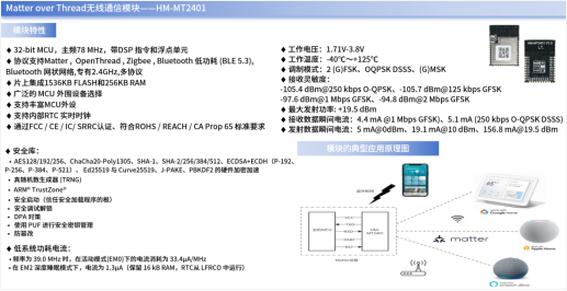 例如,HM-MT2401就是一款基于2.4GHz频段、可增强设备通信距离、优化设备运行功耗、提升设备通信安全的Matter over Thread无线通信模块,其已被广泛应用在LED灯具、无线开关、智能门锁、智能门铃、智能温控器及智能传感器等智能家居设备之中。