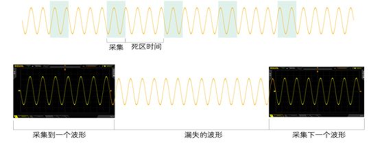 让我们回到波形捕获率这个概念上,了解一下数字示波器显示波形的过程:信号经探头后进入示波器输入通道,进入放大器,ADC,采集存储器,然后示波器会将采集存储器中的数据点传输到CPU单元进行显示处理,测量和运算。数字示波器采样、处理数据是需要时间的,这段时间称为死区时间。死区时间内示波器不采样,所以实际上不是所有波形我们都能在屏幕上看到,我们看到的波形其实是分隔成一段一段的。