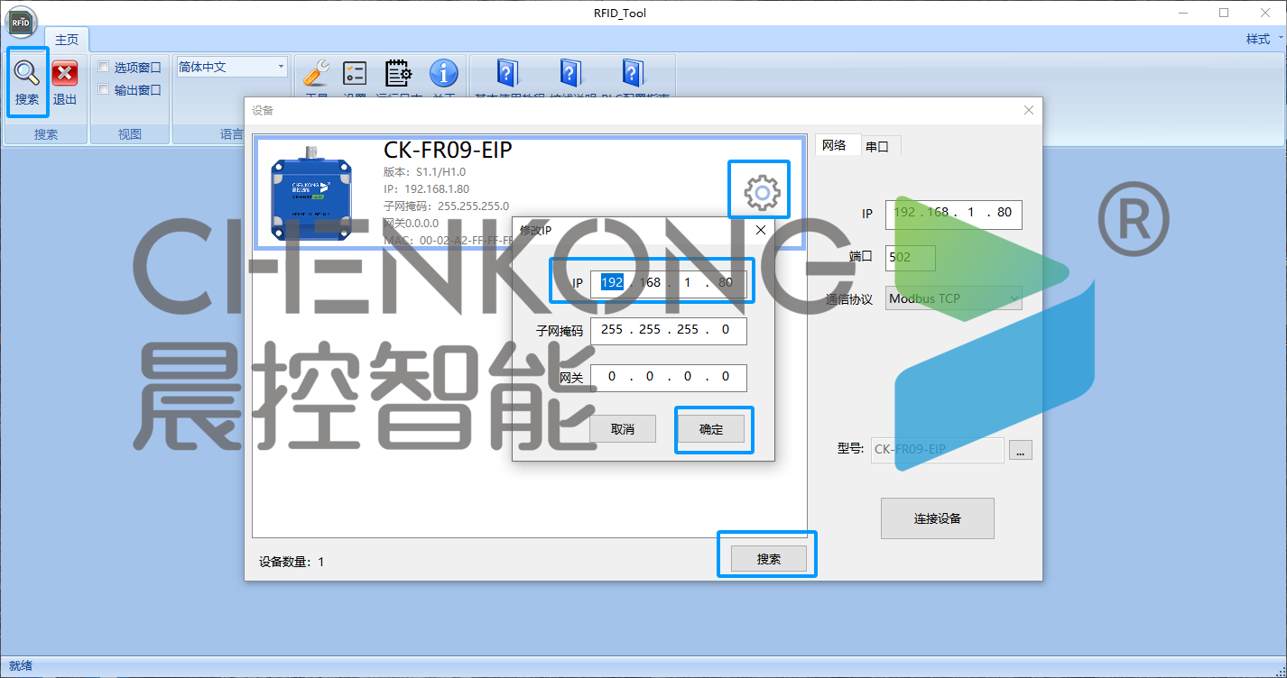 点击齿轮修改IP地址,点击确定保存,重新搜索确定