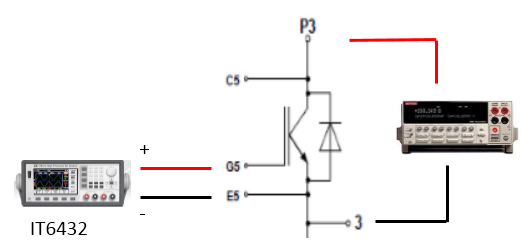 实验方法:负载控制Ic=550A,IT6432 提供Vge=15V,用DVM 表量测Vce 值。