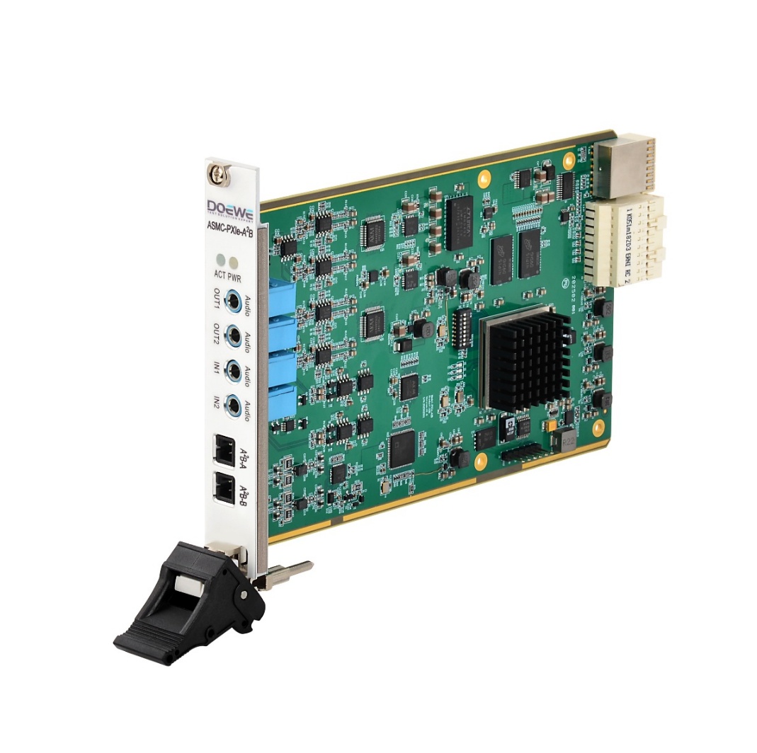 ASMC-PXIe-A²B 采用 32-bit ΔΣ ADC/DAC,采样率覆盖 48/96/192/384/768 kHz,兼顾语音到高带宽场景;在 48 kHz 下实现 >110 dB SNR、THD+N < –110 dB。板上集成 A²B 收发器(AD2428),支持最多 11 个节点(1 主 + 10 从)与 32 路上行/32 路下行通道,并支持最长约 40 m 的总线长度,适配整车菊花链拓扑。卡件提供 2 Vrms 模拟 I/O、3.5 mm TRS 兼容单端/差分输入,同时内置 IEPE 恒流源并支持 TEDS 标识,便于与传感器/治具协同。面向研发联调与兼容性验证,既可做总线波形采集,也支持节点级测试与信号注入,快速定位链路与音频一致性问题。