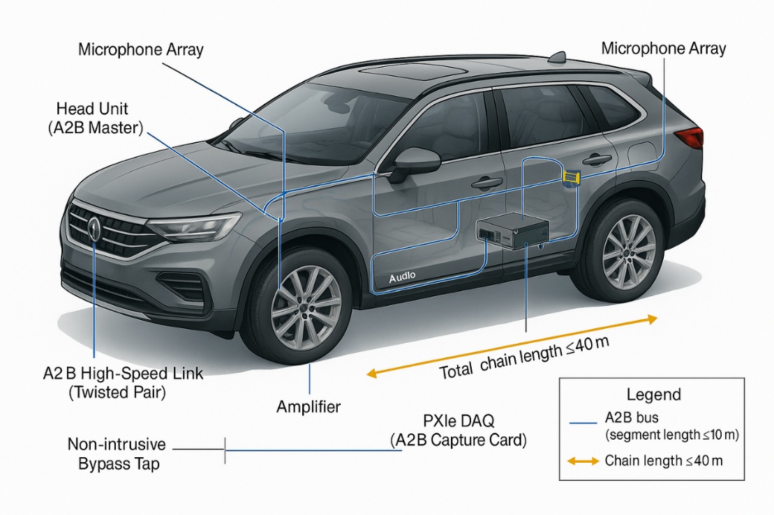 随着座舱语音交互、主动降噪(ANC)与分区音响的应用深化,A²B(Automotive Audio Bus)在整车中承担了更多时序敏感、通道众多的音频传输任务。A²B以单对非屏蔽双绞线实现音频与控制的同步传输,具备约50 Mbps的带宽与确定性、微秒级的逐跳时延,且各节点时钟保持相位对齐,这使其非常适合多麦阵与分区播放等场景,但也对链路稳定性和时序一致性提出更严苛要求。真实车辆中,电源波动、EMC耦合与线束布局可能引发帧错误、链路重建或抖动累积,单靠静态台架往往难以捕获并复现。为此,我们基于模块化数据采集平台,提供专注于A²B链路的无损接入、长时记录与在线监听方案,通过协议事件与音频载荷的同步采集,建立“发现—定位—复核—优化”的闭环。