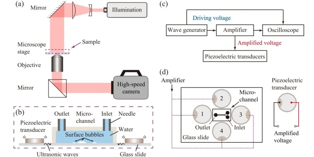 通过软光刻制备PDMS微流道,通过Aigtek功率放大器ATA-1220E/ATA-2021B放大外加电压,驱动压电超声换能器产生高频机械振动,引起微流道内部声压变化;超声波加载过程中,使用高速显微摄像的方式观察微流道内空化现象。