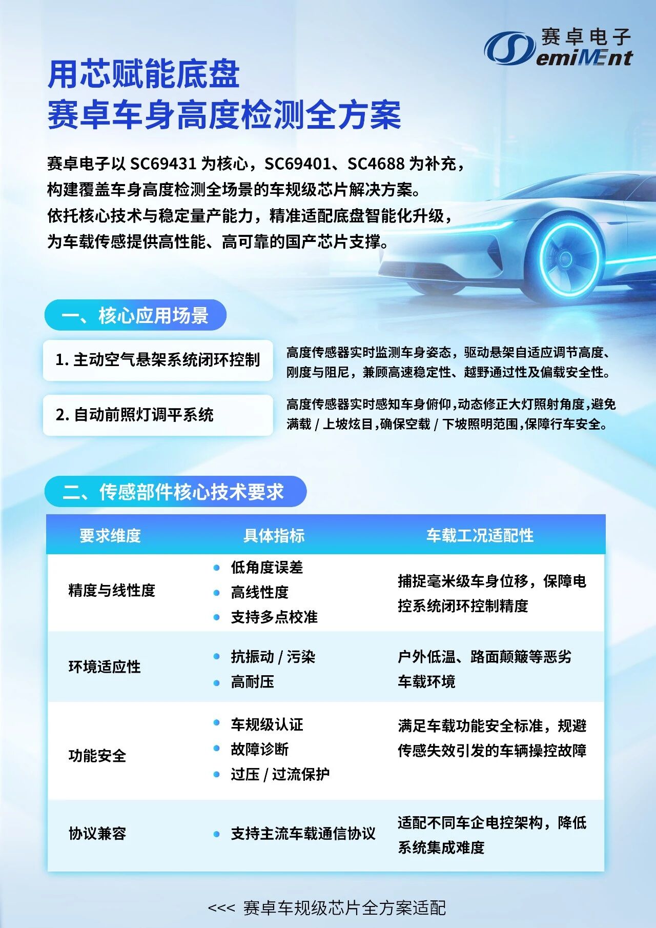 高灵活可编程方案(SC4688):依托温度补偿技术与高精度模拟输出,全参数可编程,不仅适配车身控制,更可延伸至工业阀门控制、机器人关节位置反馈等工业自动化领域。