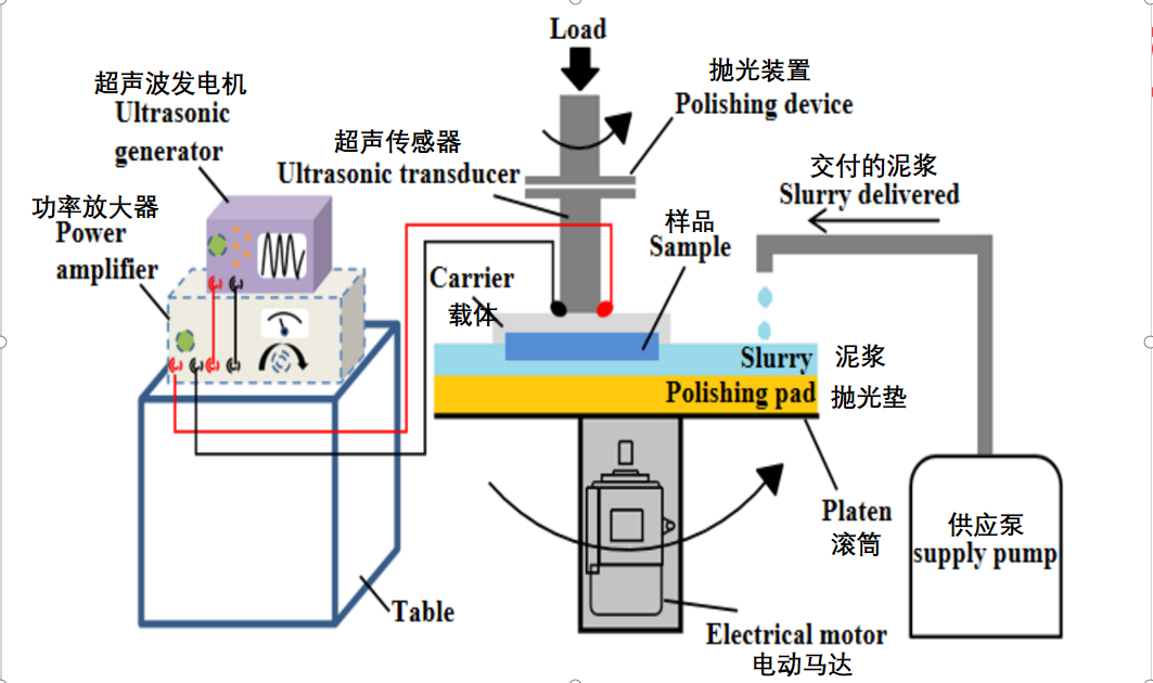 实验原理:实验设备中的超声信号发生器产生特定频率和波形的电信号,该信号经功率放大器放大后,传输给超声转换装置。超声转换装置内的压电陶瓷片将电信号转化为同频率的机械振动,再通过喇叭形盖板放大机械信号并传递给样品托,使抛光头在旋转时产生超声振动。这一振动让抛光液中的磨粒获得额外能量,加速撞击晶片表面,同时超声释放的热量能加速抛光液与晶片表面的化学反应。