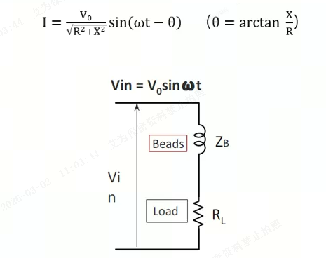 具体机理如下:手机音频线路中常用的磁珠,电感量普遍较低(如600Ω磁珠,电感量约1uH),在音频频段内,感抗X=2πfL较小,即使在磁化过程中发生100%的变化,X2相对于R2也可忽略,因此上述*式中,表征电流波形幅度的部分V₀/√(R^2+X^2 )可视为恒定值而无须分析,X的变化主要影响电流波形的相位θ=arctanX/R)。