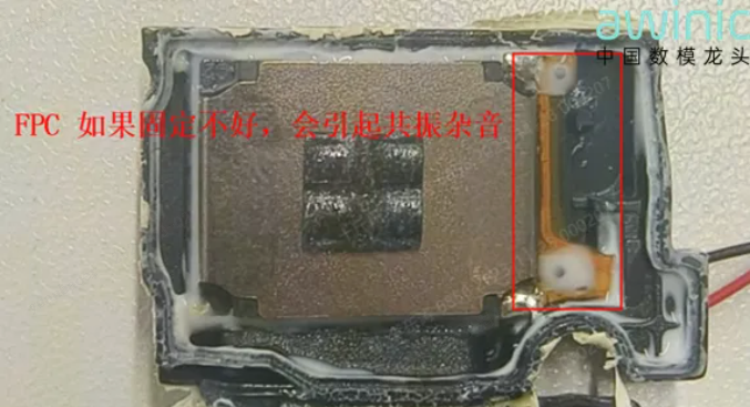 FPC共振杂音:喇叭连接的FPC(柔性电路板)在音频振动过程中发生共振,进而产生杂音,具体共振位置可参考下图: