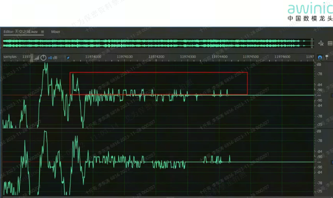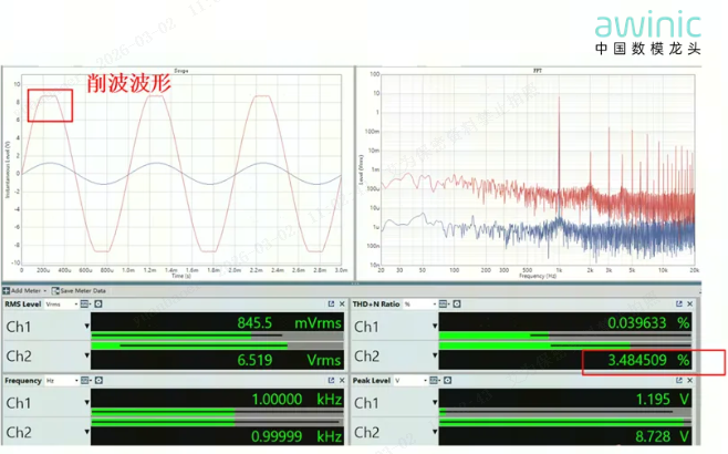 超出额定值的部分会形成削波失真。针对此类问题,艾为功放的AGC(自动增益控制)技术可实现有效改善,具体效果可参考如下截图: