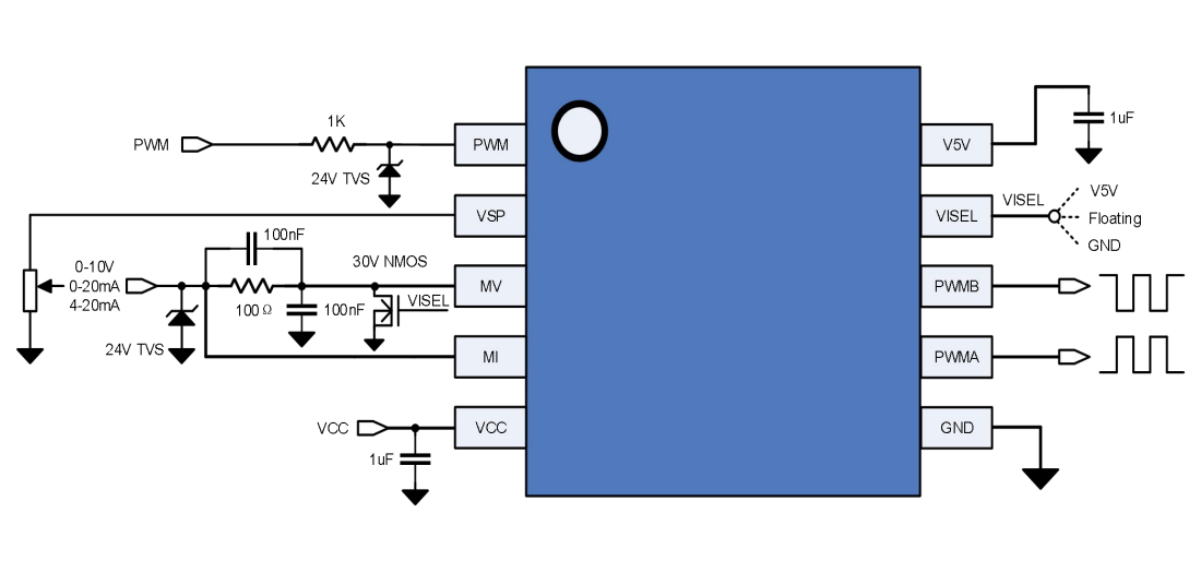 三态输入选择:通过一个简单的VISEL引脚,即可在电压输入(VISEL接GND)、电流输入(VISEL接5V)、PWM输入(VISEL浮空)三种模式间轻松切换,一颗芯片满足多种应用场景,设计灵活性极强。