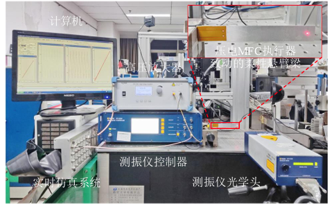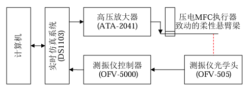 测试设备:ATA-2041高压放大器、压电MFC执行器致动的柔性悬臂梁、计算机、测振仪控制器、实时仿真系统、测振仪光学头。