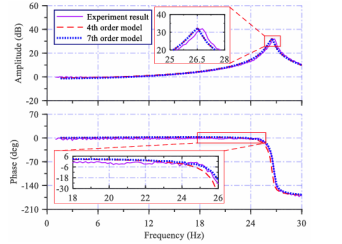 4、柔性悬臂梁动态力学模型由七阶简化为四阶后,与实验数据在幅频和相频响应上仍保持较高吻合度,可稳定用于宽频带线性化控制。