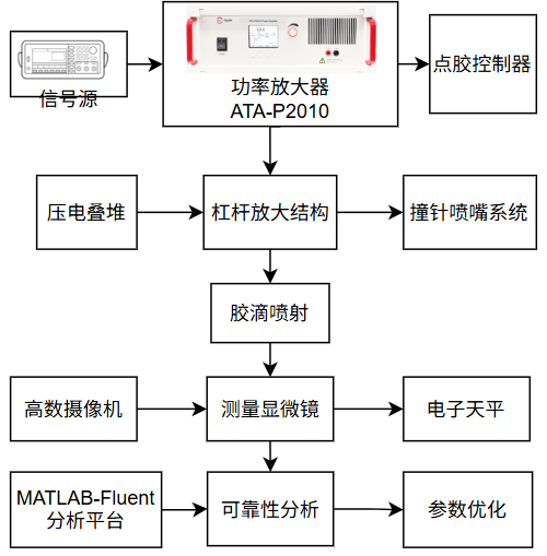 实验原理:本研究基于区间过程的胶粘剂流变特性不确定性理论和撞针式压电喷射系统的机电液耦合动力学模型,利用压电叠堆的逆压电效应驱动撞针产生高频往复运动,从而实现胶粘剂的精确微量分配;通过多源不确定性参数的度量与预测模型,结合高保真Matlab-Fluent多场耦合分析平台和实验装置进行动力学仿真与验证;创新采用贝塞尔曲线驱动波形优化和主动学习RBFNN代理模型进行可靠性评估,实验表明能有效降低空气回吸量,并在高频分配下提升胶滴体积一致性,为大规模集成电路封装中的胶粘剂微量分配提供高精度、高可靠性控制方案。