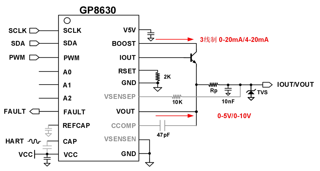 GP8630 (PWM模式):通过A0, A1, A2三个地址引脚的电平组合,即可简单配置为0-12V电压或0-24mA电流输出模式。