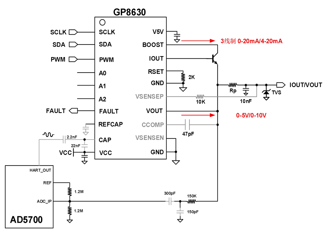 智能变送器:将温度、压力、流量等传感器信号,经MCU处理后,通过GP8630转换为远传的4-20mA标准信号。