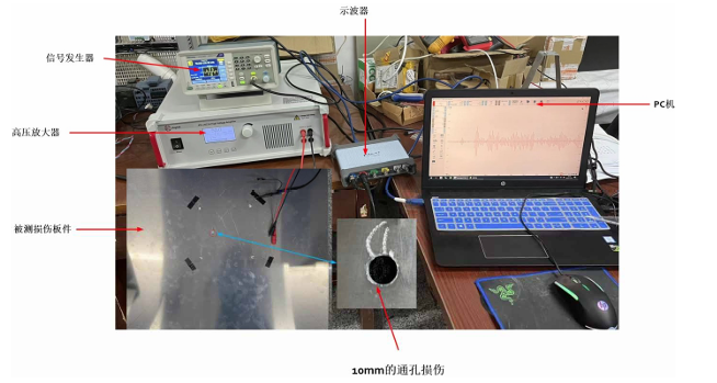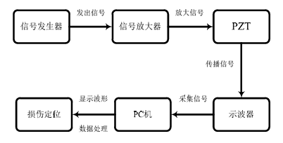 实验原理:基于Lamb波的结构健康监测系统,由信号发生器激励Lamb波信号,压电传感器将电信号转为机械振动并带动被测板件振动,使Lamb波在结构中传播,其他位置的压电接收元件通过逆压电效应将机械振动转回电信号,经示波器采集后传输至PC机,通过分析响应信号完成板件损伤定位。