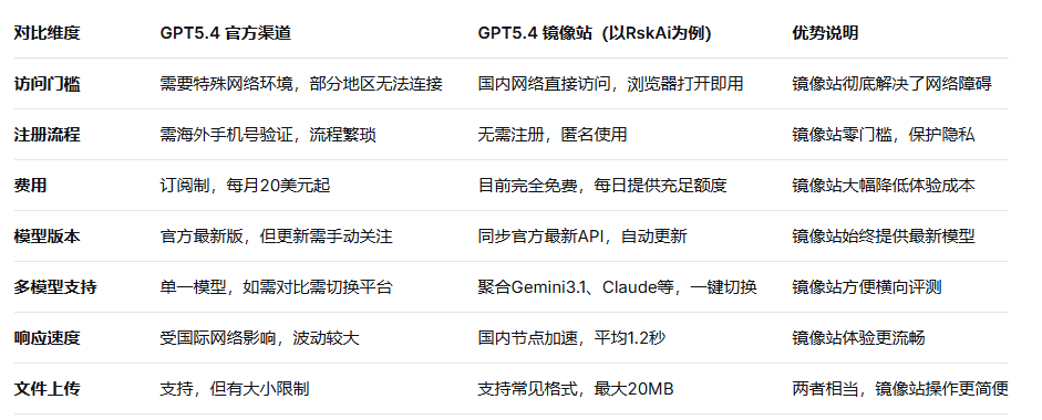 从表格可见,对于国内普通用户和开发者,镜像站无疑是体验GPT5.4最高效的方式。而RskAi作为聚合镜像站,还提供了额外的对比价值。