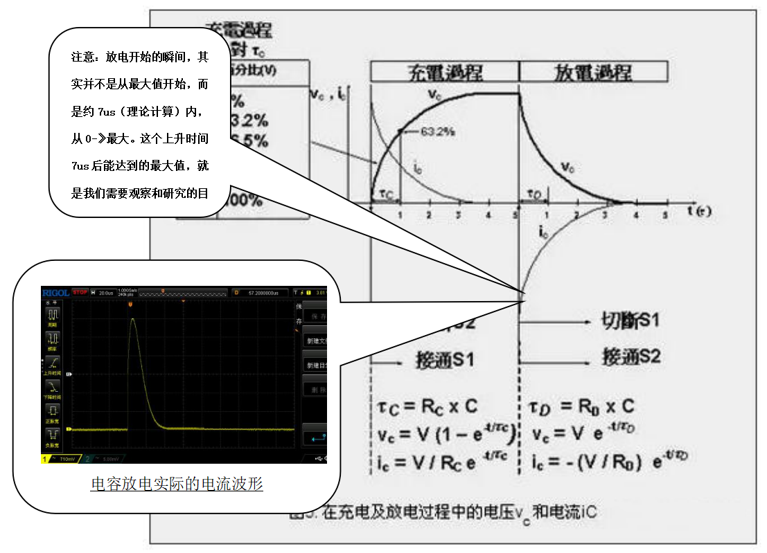 图4为电容充电、放电的理论和放电电流的计算公式;