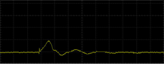 实际测试来看,同一种IRF3205的MOS,同为100u/100v,固态电容,从分析电流密度图来看,第一版应该要比第二版要好,实际测试情况也是如此(见下图中,MAX: 431mV / 506mV),即:7μs达到的最大值,第一版要好过第二版,计算来看,大约是好506/431=1.17倍。下述的测量,基于CM4A H00器件和RIGOL 100Mhz的示波器,电容电压为12V;