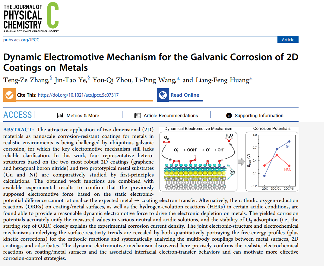 The Journal of Physical Chemistry C 中国科学院宁波材料技术与工程研究所 王利平、黄良锋团队 二维材料防腐涂层的 “腐蚀加速器” 之谜,被动态电动势机制破解